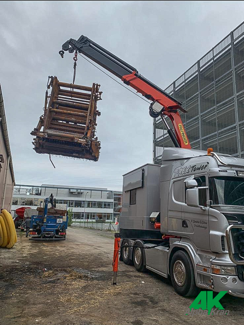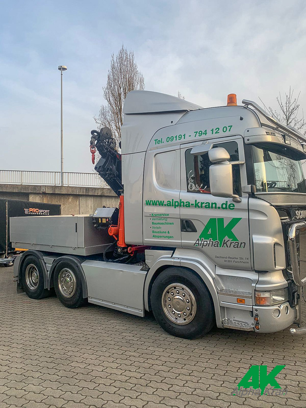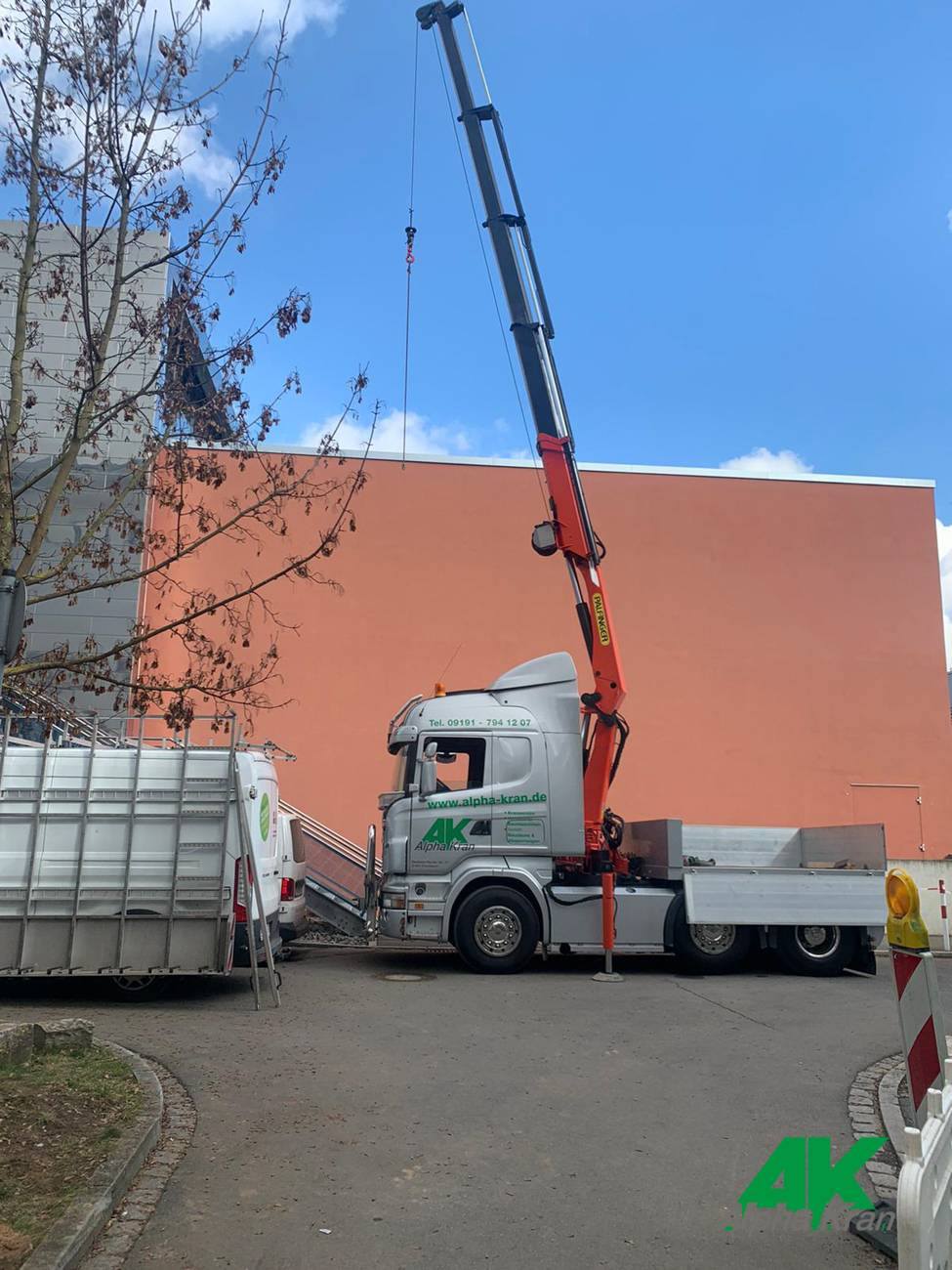 Mit unserem 3achs SCANIA mit Palfinger Kran können wir Lasten bis zu 5t im Abstand von 3 Metern heben, 400kg bei bis zu einer Entfernung von 25m.